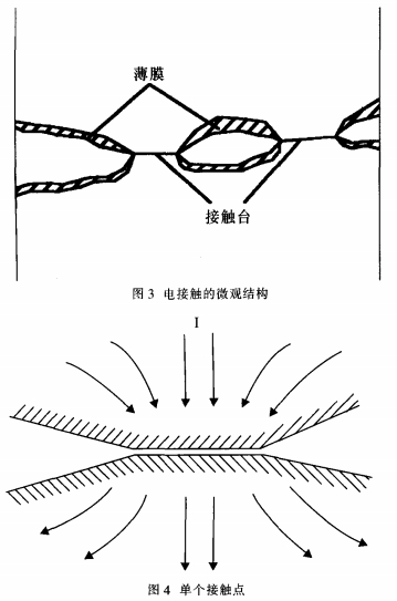 要知道在母線槽聯(lián)接處的電阻,除了母線槽自身存在的電阻外,還存在一個(gè)接觸電阻。這是因?yàn)?不管母線槽表面處理得怎樣光滑平坦,在微觀環(huán)境下,母線槽表面也是凹凸不平的,如圖3所示,兩片母線槽之間的搭接實(shí)踐上只要母線槽表面上許多小尖峰之間的接觸,電流流過(guò)搭接面的實(shí)踐面積減少了,電流線發(fā)生嚴(yán)峻的縮短現(xiàn)象,發(fā)生縮短電阻R,取其中一點(diǎn)剖析其結(jié)構(gòu)如圖4所示。另一方面,母線槽從加工結(jié)束到裝在開(kāi)關(guān)柜里有必定的時(shí)間差,很簡(jiǎn)單因?yàn)楸┞对诳諝饫锒鴺?gòu)成一層薄膜(如氧化膜等),使電阻增大,稱為膜電阻R,。所以接觸電阻實(shí)踐上是由這兩部分組成,即