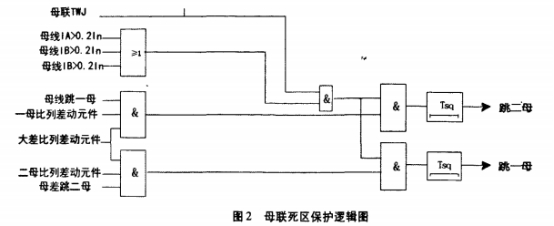 若母聯(lián)開關(guān)和母聯(lián)TA之間發(fā)生毛病,斷路器側(cè)母線槽跳開后毛病依然存在,正好處于TA側(cè)母線槽小差的死區(qū),為進(jìn)步保護(hù)動作速度,本設(shè)備專設(shè)了母聯(lián)死區(qū)保護(hù),其邏輯框圖如圖2。
