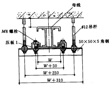 4.3母線槽懸掛吊裝。(圖4、圖5)吊桿直徑應(yīng)與母線槽分量相適應(yīng),螺母應(yīng)能調(diào)理。