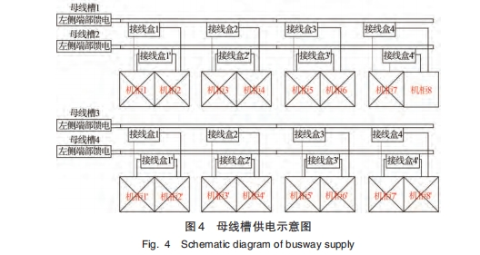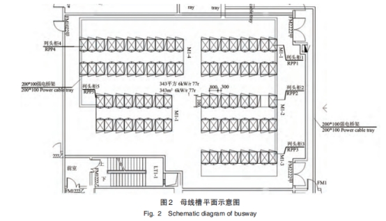 端部饋電模塊由每一列機(jī)柜對應(yīng)的主備供母線槽各配備1個接入配電盒,與主干母線槽的插接箱間選用電纜聯(lián)接。