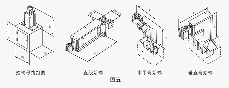 始端母線與始端進(jìn)線箱配套組成母線槽與電纜、配電柜、變壓器的連接件(圖五)作用于母線槽的電源輸入或輸出端,始端母線分:直線始端,水平彎始端,垂直彎始端。始端進(jìn)線箱外形尺寸W×H視用戶的電器設(shè)備尺寸而定。見圖五